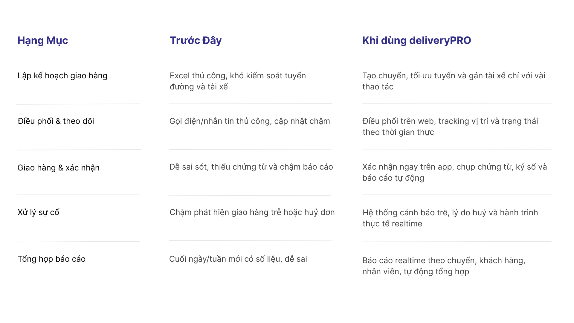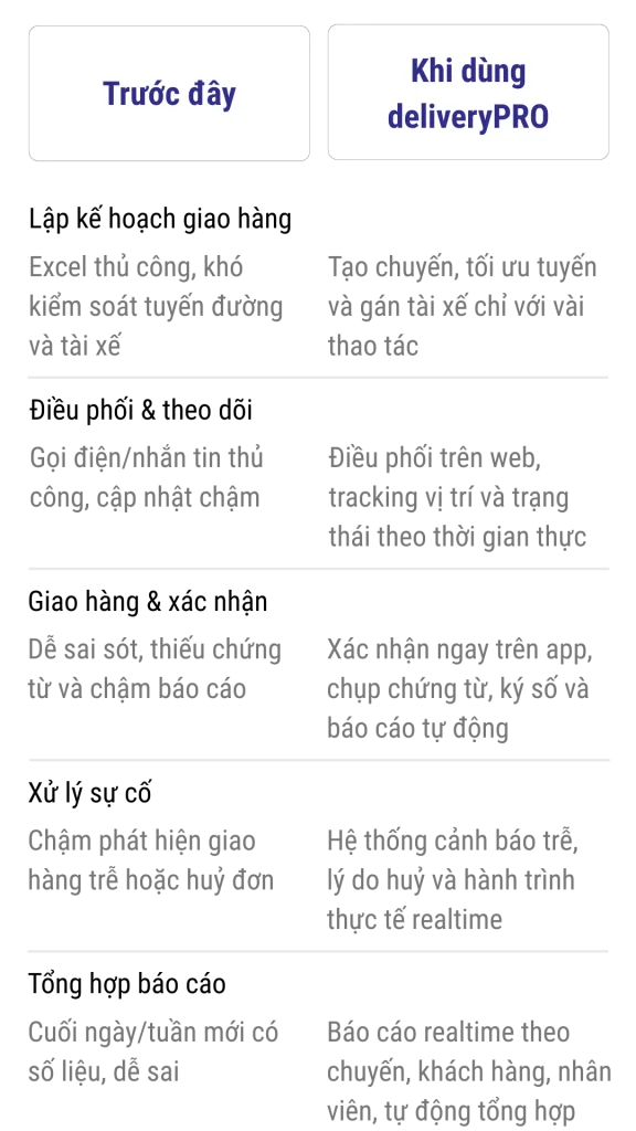 Từ việc quản lý nội bộ đến mở rộng vùng phủ, deliveryPRO giúp doanh nghiệp tăng tốc độ triển khai và kiểm soát toàn diện thị trường.