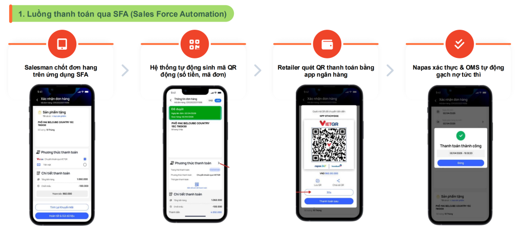 Thanh toán ngay khi nhận hàng: Salesman chốt thông tin đơn hàng trên ứng dụng của nhãn hàng, mã QR tự động sinh ra kèm đúng số tiền đơn hàng. Khách hàng quét mã và hệ thống gạch nợ tức thì.